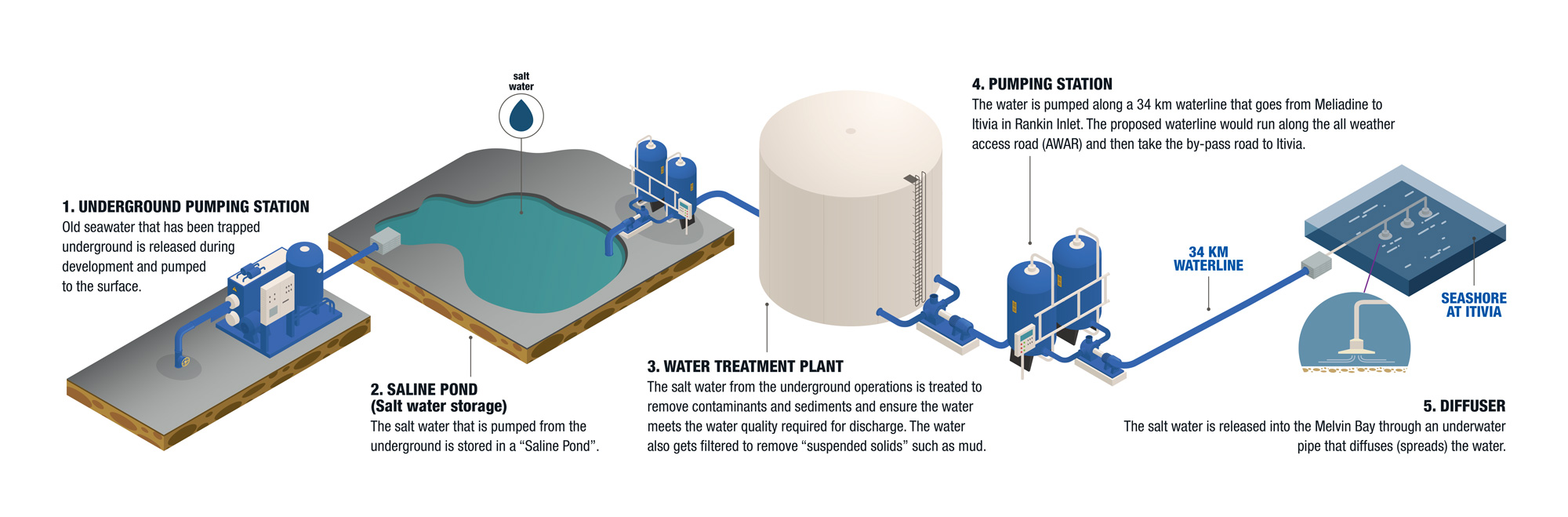 As Meliadine mine development began, it was known that the inflows of groundwater would be a challenge. The natural groundwater inflows is old trapped seawater that is being released during underground operations now that we are under the permafrost level. Therefore, it cannot be discharge to Meliadine Lake which is a fresh water lake. The option to discharge the excess saline water from the underground saline water to the ocean being considered. The groundwater will be treated to meet discharge water quality criteria for Melvin Bay. Agnico Eagle anticipates that treatment for ammonia and Total Dissolved Solids (TDS) will be required so that it is safe to discharge into the ocean.